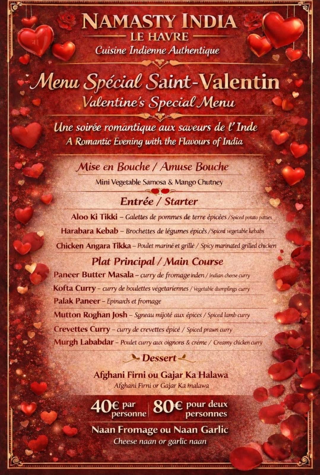 Le Namasty India vous a préparé un menu spécial, raffiné et gourmand, pensé pour partager un moment unique à deux.